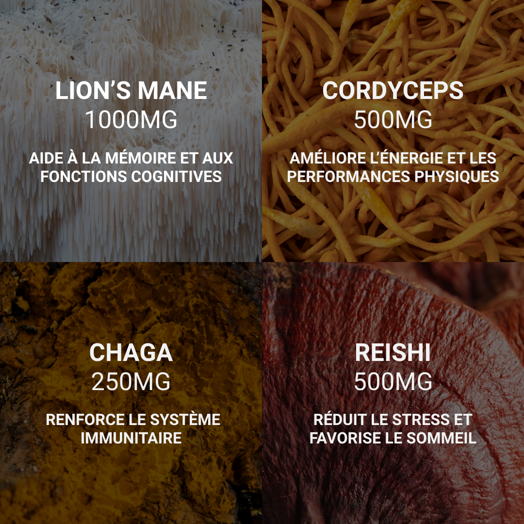 Chaque portion fournit 2 250 mg d’extraits de champignons adaptogènes, issus du corps fructifère et extraits par double extraction.